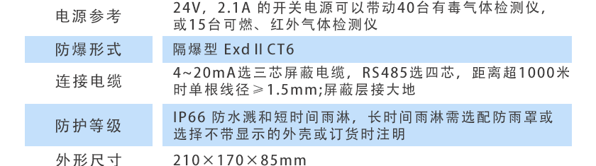 24V,2.1A 的開關(guān)電源可以帶動(dòng)40臺(tái)有毒氣體檢測儀,或15臺(tái)可燃、紅外氣體檢測儀 |