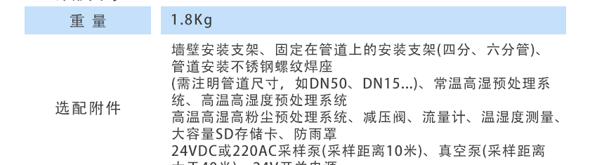 墻壁安裝支架、固定在管道上的安裝支架(四分、六分管)、管道安裝不銹鋼螺紋焊座 (需注明管道尺寸,如DN50、DN15...)、常溫高濕預(yù)處理系統(tǒng)、高溫高濕度預(yù)處理系統(tǒng)、 高溫高濕高粉塵預(yù)處理系統(tǒng)、減壓閥、流量計(jì)、溫濕度測量、大容量SD存儲(chǔ)卡、防雨罩、 24VDC或220AC采樣泵(采樣距離10米)、真空泵(采樣距離大于40米)、24V開關(guān)電源 |