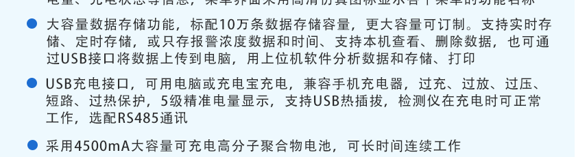 CO(0~1000ppm)、H2S(0~100ppm)、O2(0~30%Vol)、Ex(0~LEL)、CO2(0~5000ppm)、NOX(0~1000ppm),其他量程可訂制