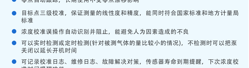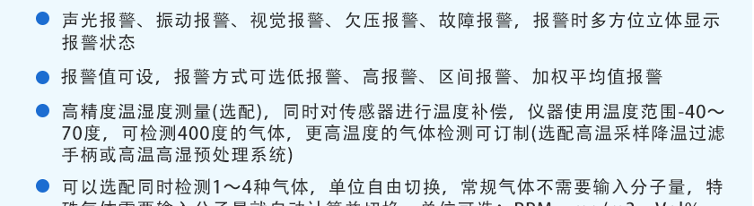 CO(0.1ppm)、H2S(0.01ppm)、O2(0.01%Vol)、Ex(0.1%LEL)、CO2(1ppm)、NOX(0.1ppm),分辨率可訂制1ppm(0~1000 ppm以上),0.1%LEL(0~100%LEL)、0.01%Vol或0.001%Vol(0~99.999%Vol)