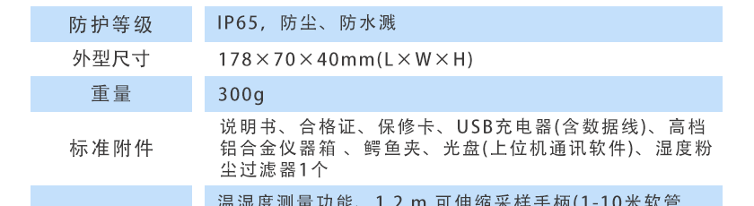 溫濕度測量功能、1.2 m 可伸縮采樣手柄(1-10米軟管,標準長度1米)、高溫采樣降溫過濾手柄、高溫高濕預處理系統、濕度粉塵過濾器多個、掛繩