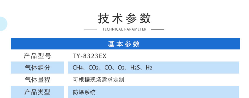 • 防爆壁掛式沼氣分析系統 TY-6090EX 采用進口NDIR非分光紅外傳感器,長壽命電化學傳感器,運用先進的數字處理技術,可同時測量沼氣中CH4、CO2、H2S、O2、CO、H2的體積濃度,根據氣體濃度值快速準確計算出相應的熱值。