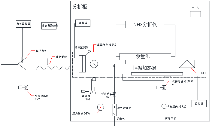 如系統(tǒng)流程圖所示,樣氣經(jīng)采樣探頭,由采樣伴熱管輸送至預(yù)處理單元,預(yù)處理單元包括常閉型高溫閥SV1,精密過濾器、射流泵,其中SV1閥用于在停止采樣時(shí)切斷氣路,精密過濾器用于進(jìn)一步凈化樣氣,去除樣氣中的粉塵等,射流泵則用于提供樣氣傳輸時(shí)的動(dòng)力,系統(tǒng)由PLC控制實(shí)際自動(dòng)周期采樣及吹掃。所有樣氣流經(jīng)元件及管路均置于恒溫加熱盒中,防止管路被銨鹽堵塞,減少樣氣損失。