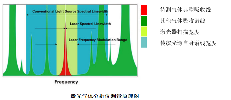 2.4.2 優(yōu)點(diǎn)可調(diào)諧半導(dǎo)體激光光譜吸收技術(shù)TDLAS本質(zhì)上是一種光譜吸收技術(shù),通過分析激光被氣體分子的選擇性吸收來獲得氣體的濃度。它與傳統(tǒng)紅外光譜吸收技術(shù)的不同之處在于,半導(dǎo)體激光光譜寬度遠(yuǎn)小于氣體吸收譜線的展寬,如上圖。因此,半導(dǎo)體激光吸收光譜技術(shù)是一種高分辨率的光譜吸收技術(shù)。系統(tǒng)采用特定波長(zhǎng)的激光束穿過被測(cè)氣體,激光強(qiáng)度的衰減與氣體的濃度滿足朗伯.比爾定理,因此可以通過檢測(cè)激光強(qiáng)度的衰減信息分析獲得被測(cè)氣體的濃度。采用半導(dǎo)體激光吸收光譜技術(shù)的激光氣體分析儀可從原理上抗背景氣體的干擾,測(cè)量結(jié)果可靠性高。