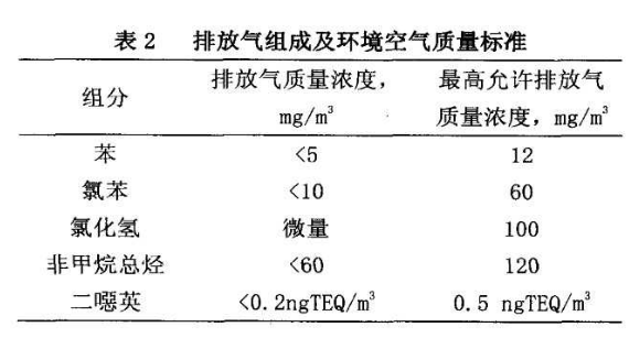 按表1中各污染物排放最為嚴(yán)格的標(biāo)準(zhǔn)制定了該企業(yè)的治理目標(biāo),即ρ(非甲烷總烴)不大于20mg/m3;ρ(苯)不大于4mg/m3;ρ(氯苯類)不大于50mg/m3;ρ(氯化氫)不大于30mg/m3;ρ(二噁英)不大于0.1ng/m3。