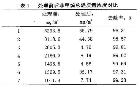 不同濃度廢氣處理前后非甲烷總烴質(zhì)量濃度對(duì)比見(jiàn)表1。
