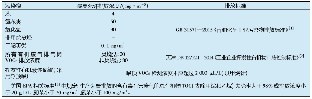 目前國(guó)內(nèi)外有機(jī)化工裝置的苯和氯苯類污染物排放標(biāo)準(zhǔn)見(jiàn)表1。我國(guó)各項(xiàng)污染物排放標(biāo)準(zhǔn)均嚴(yán)于美國(guó)EPA的排放標(biāo)準(zhǔn)。