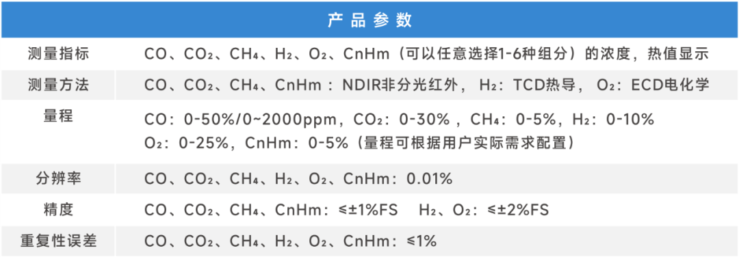 1)儀器測量樣氣中氣體的體積濃度同時輸出熱值,增加超量程限值使能功能,量程范圍內(nèi)保證測量精度,超量程可測量,提供測量值參考;