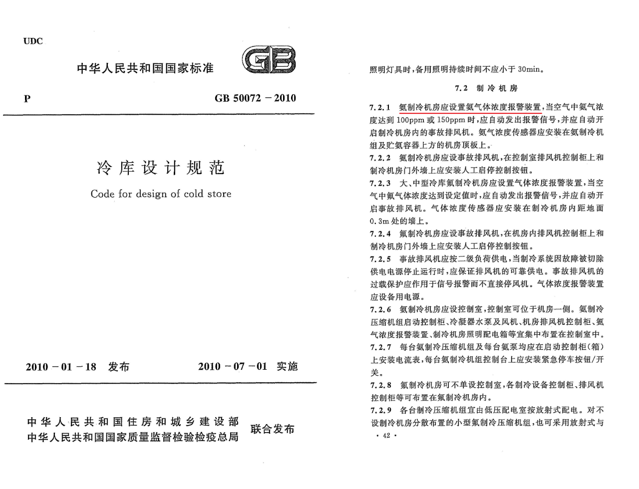 根據(jù)《GB50072-2010冷庫設(shè)計規(guī)范》氨制冷機(jī)房應(yīng)該設(shè)置氨氣濃度報警裝置: