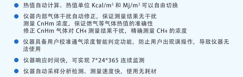 采用進(jìn)口NDIR非分光紅外傳感器,長壽命電化學(xué)傳感器,運(yùn)用先進(jìn)的數(shù)字處理技術(shù),可同時測量沼氣中CH4、CO2、H2S、O2、CO、H2的體積濃度,根據(jù)氣體濃度值快速準(zhǔn)確計算出相應(yīng)的熱值。