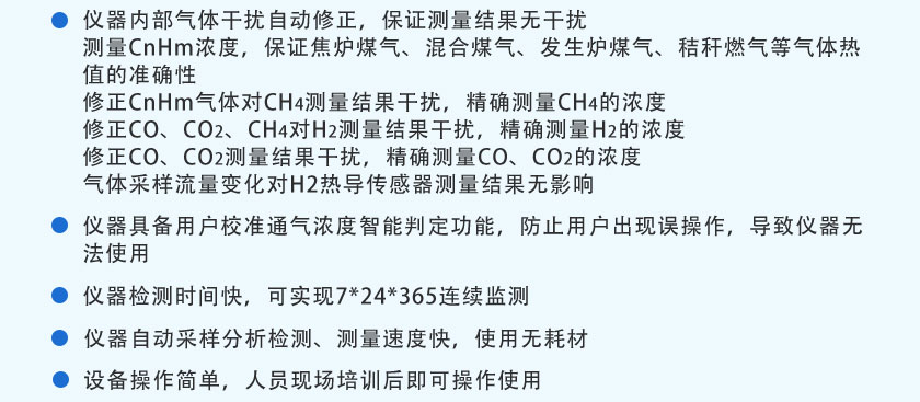 CO、CO2、CH4、CnHm :NDIR非分光紅外;H2:TCD熱導, O2:ECD電化學